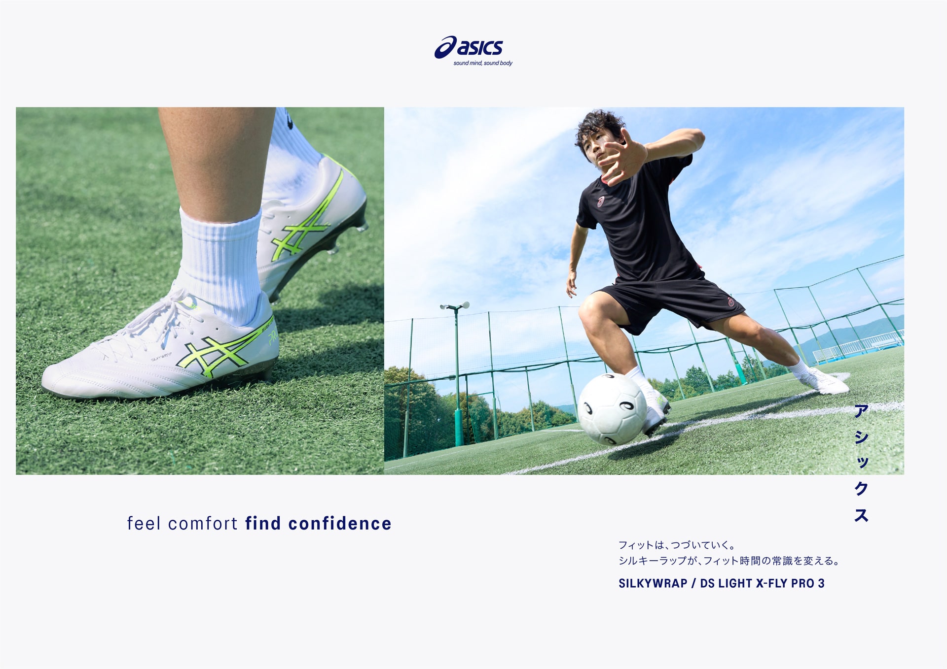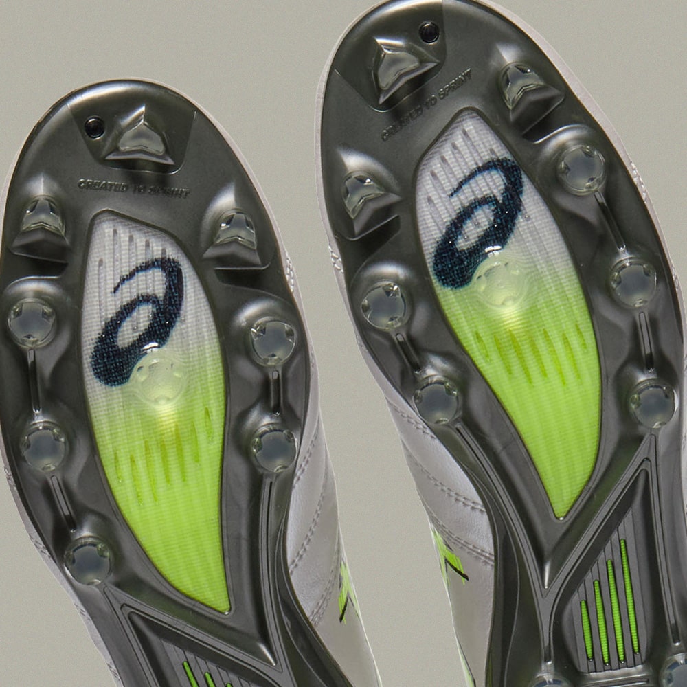 ダッシュ一歩目の少し外側に開いた状態に注目し、より高い推進力を得るためにスタッドの形状などを見直し、アップデート。縦のグリップが効きやすいようにつま先から2列目のスタッドをブレード形状に近づけ、角度も蹴り出し方向へグリップが効くように、傾けることによって、選手のパフォーマンスをサポート。 デジタル設計により、大胆にくり抜かれたアウトソールが、軽量性と屈曲性を生み出す。超薄型×高硬度仕様で軽量性とスプリント時に必要な反発性をサポート。