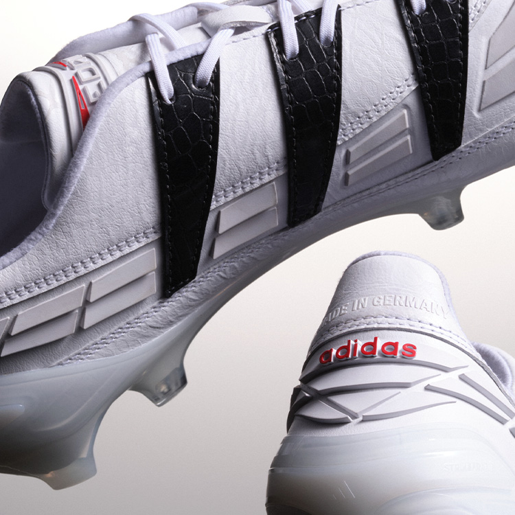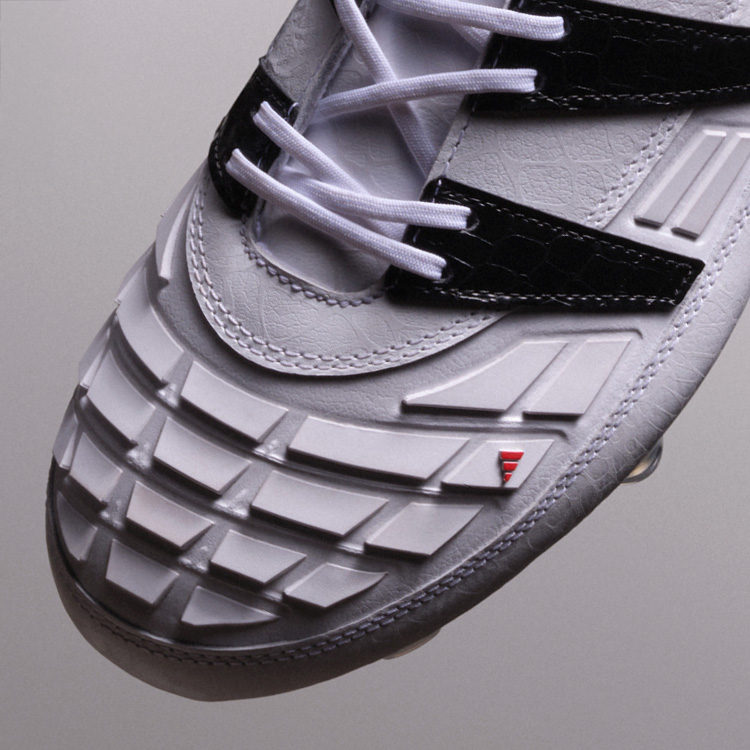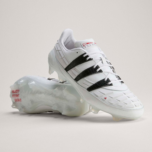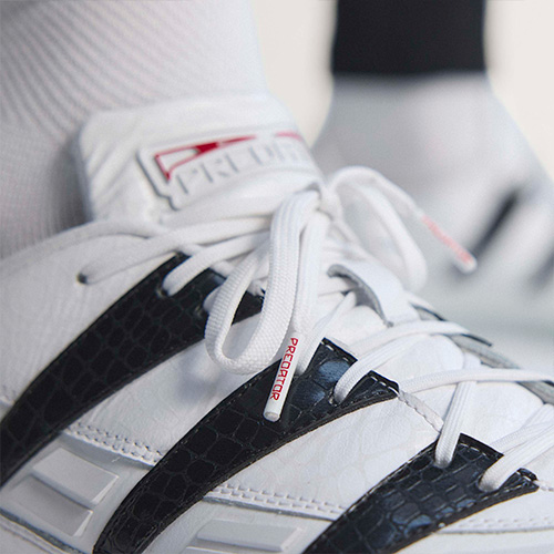 ブラックのスリーストライプスはクロコダイルレザー調のテクスチャーで表現され、ホワイトのシューレースとシュータンのホワイトPREDATORロゴ、そしてヒールには鮮やかなレッドのadidasロゴを配置。