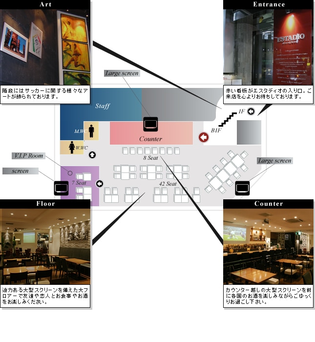 大型のプロジェクターが2台ある広々とした店内。落ち着いた空間の中、どの席からもゆっくりと世界のフットボールを堪能して頂けます。