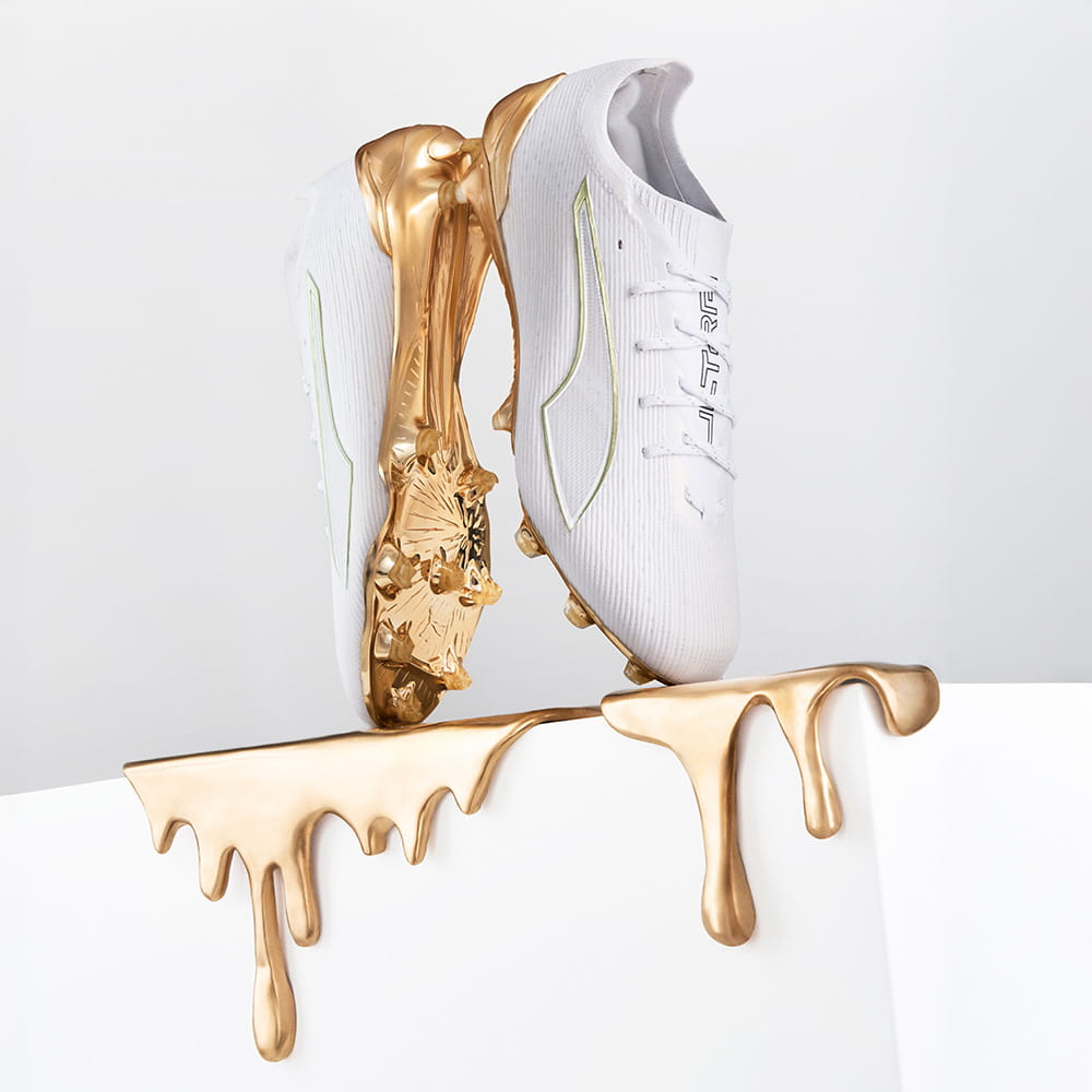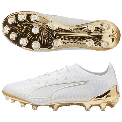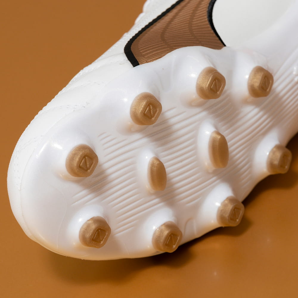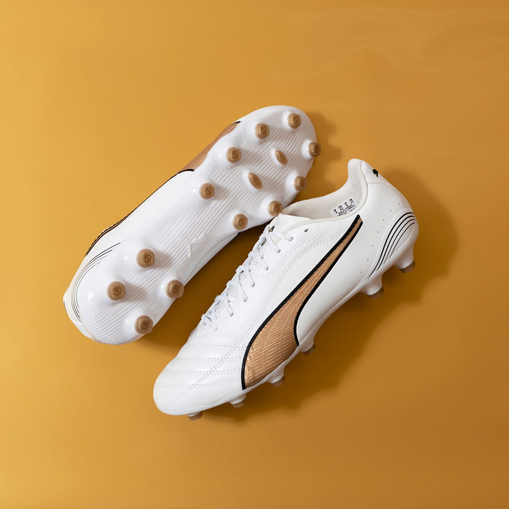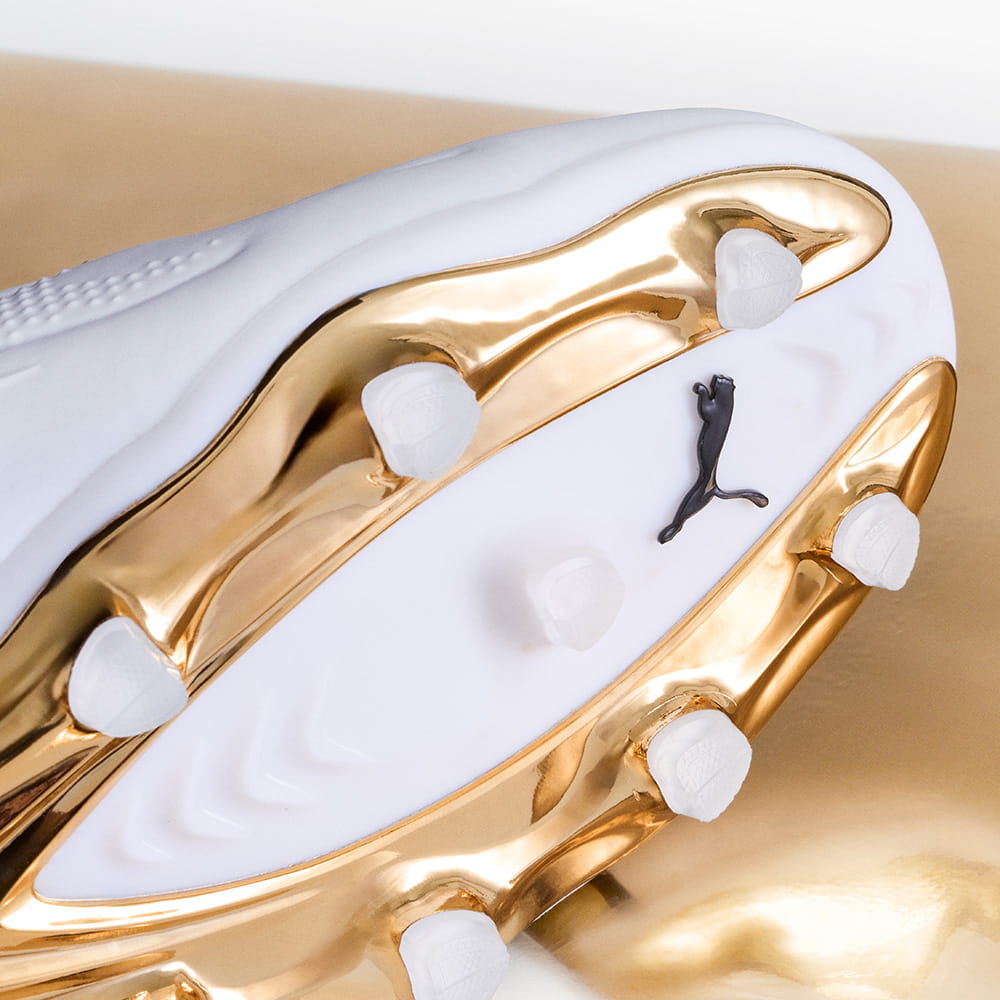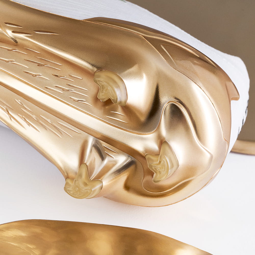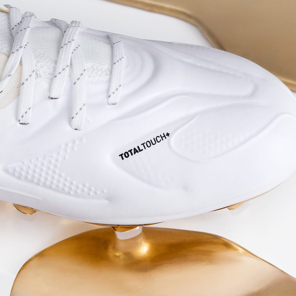 ホワイトアウトのカラーと、磨き上げられたゴールドのソールプレートが、タッチのたびに存在感を引き上げる。 このフットボールブーツは、まさにゴールド級の価値――そしてゴールをもたらす一足。