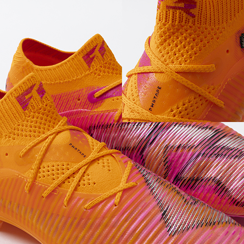●伸縮性の高いLYCRAと伸縮性に優れたニットで構成されたシューズのベースレイヤーは、第二の皮膚として機能し、足の動きに密着し、さらに適応性とサポート力のあるフィット感を実現します。複数に独立した3D PODSは、足の動きに沿いつつ全ての動きに対して、FUSION SKIN(フュージョン スキン)が足に沿うつくりになっています。また3D仕様のPODSがボールタッチ時の足のサポートをもたらします。