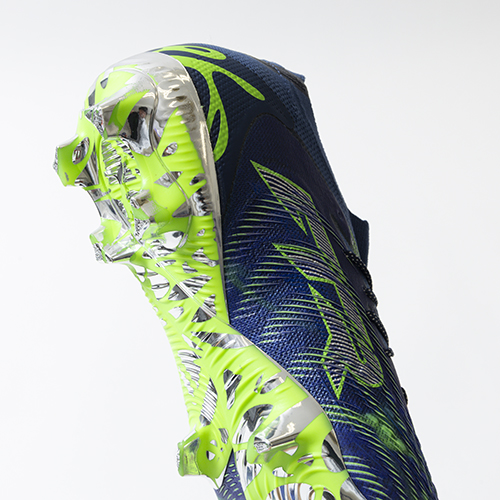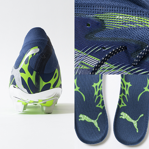 ●3D仕様のパフプリント加工でセットされたフュージョンポッズ。フュージョンスキン上に独立した形で配置されており、ダイナミックな足の動きに適応し、キッキング時のボールタッチをサポートします。