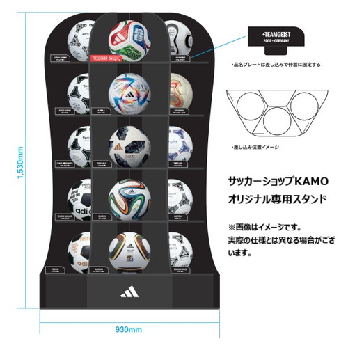 サッカーショップKAMOオリジナルの専用ボールスタンドをご用意しました。各大会の年号・都市・商品名が記載されており、歴史を振り返る事のできる特別デザイン。