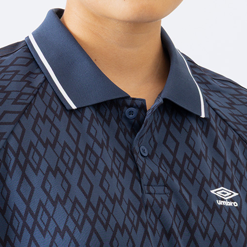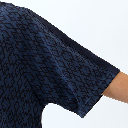 シーズングラフィックを大胆にジャガード柄に落とし込んだ襟付きプラクティスシャツ。肩口のラインテープがデザインポイント。裏側の縫い代に消臭テープ『DEO SCREEN』を縫い付けることで快適な着心地を実現。