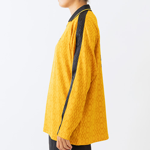 シーズングラフィックを大胆にジャガード柄に落とし込んだ襟付きプラクティスシャツ。肩口のラインテープがデザインポイント。裏側の縫い代に消臭テープ『DEO SCREEN』を縫い付けることで快適な着心地を実現。